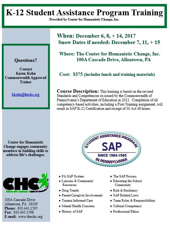 This training is based on the revised Standards and Competencies re-issued by the Commonwealth of Pennsylvania’s Department of Education in 2012. Completion of all competency-based activities, including a post-training assignment, results in SAP K-12 certification and receipt of 30 Act 48 hours.