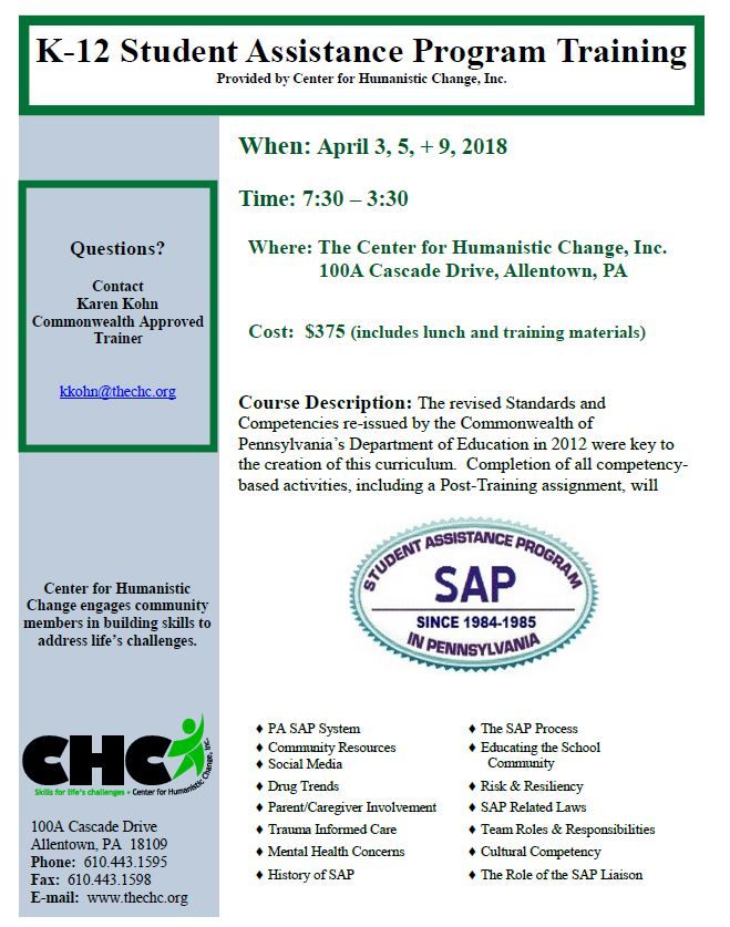 This training is based on the revised Standards and Competencies re-issued by the Commonwealth of Pennsylvania’s Department of Education in 2012. Completion of all competency-based activities, including a post-training assignment, results in SAP K-12 certification and receipt of 30 Act 48 hours.