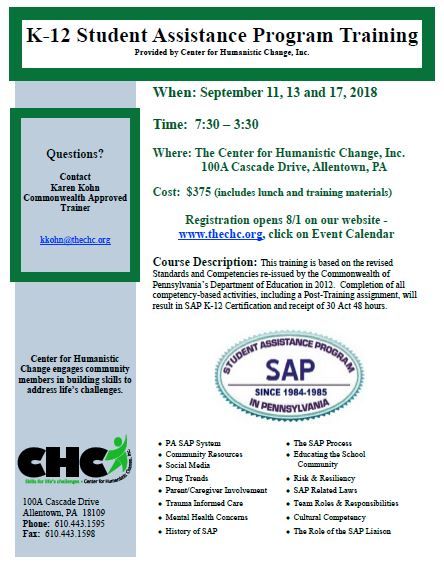 This training is based on the revised Standards and Competencies re-issued by the Commonwealth of Pennsylvania’s Department of Education in 2012. Completion of all competency-based activities, including a post-training assignment, results in SAP K-12 certification and receipt of 30 Act 48 hours.