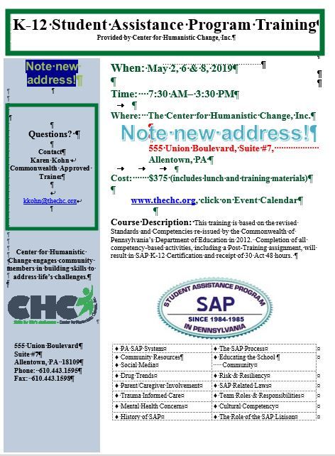 This training is based on the revised Standards and Competencies re-issued by the Commonwealth of Pennsylvania’s Department of Education in 2012. Completion of all competency-based activities, including a post-training assignment, results in SAP K-12 certification and receipt of 30 Act 48 hours.