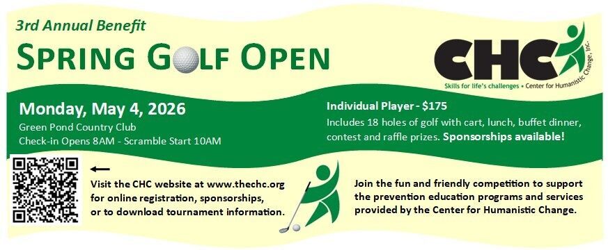 Join the fun and friendly competition for a worthy cause at the 3rd Annual Spring Golf Open, benefiting the Center for Humanistic Change's programs and services. The tournament will be held at Green Pond Country Club on May 4, 2026. It includes 18 holes of golf with a cart, a light lunch, a hot buffet dinner with beverages, contest prizes, and a premium raffle.